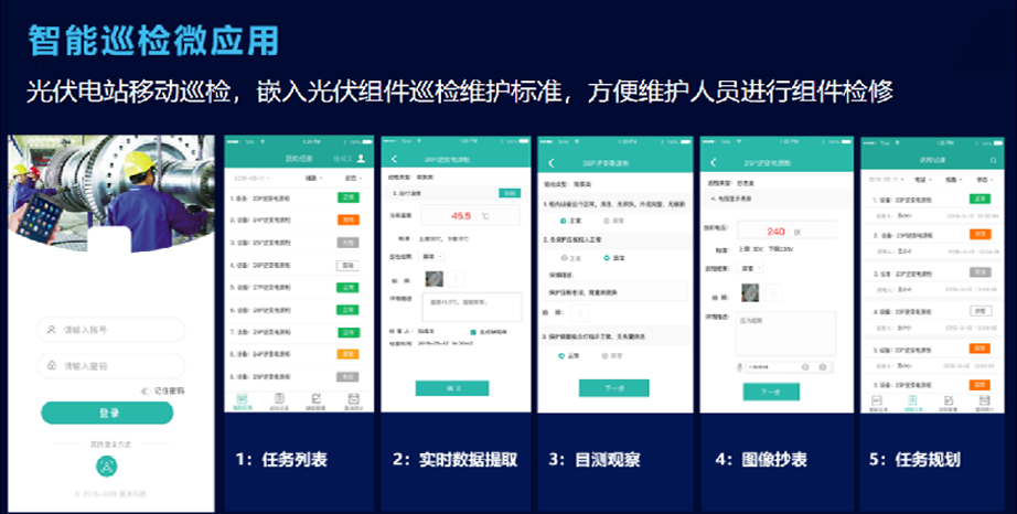 使用無人機(jī)搭載紅外熱成像和可見光相機(jī),在光伏電站高空飛行拍攝采集光伏組件的熱成像、可見光影像數(shù)據(jù),實現(xiàn)無人機(jī)的智能化巡檢,提高光伏組件巡檢效率和安全性。通過AI智能圖像對拍攝的光伏組件、匯流箱等常見缺陷進(jìn)行快速獲取、識別、分析,自動生成故障診斷報告,并將分析結(jié)果發(fā)送到云服務(wù)器,通過運(yùn)維管理工具,上級管理部門可進(jìn)行數(shù)據(jù)查看和技術(shù)管理,巡檢人員可通過故障導(dǎo)航APP輔助快速確定缺陷組件及位置,進(jìn)行相關(guān)維護(hù)檢修,提高巡檢效率,提升光伏電站的消缺率,增加電站的經(jīng)濟(jì)效益。