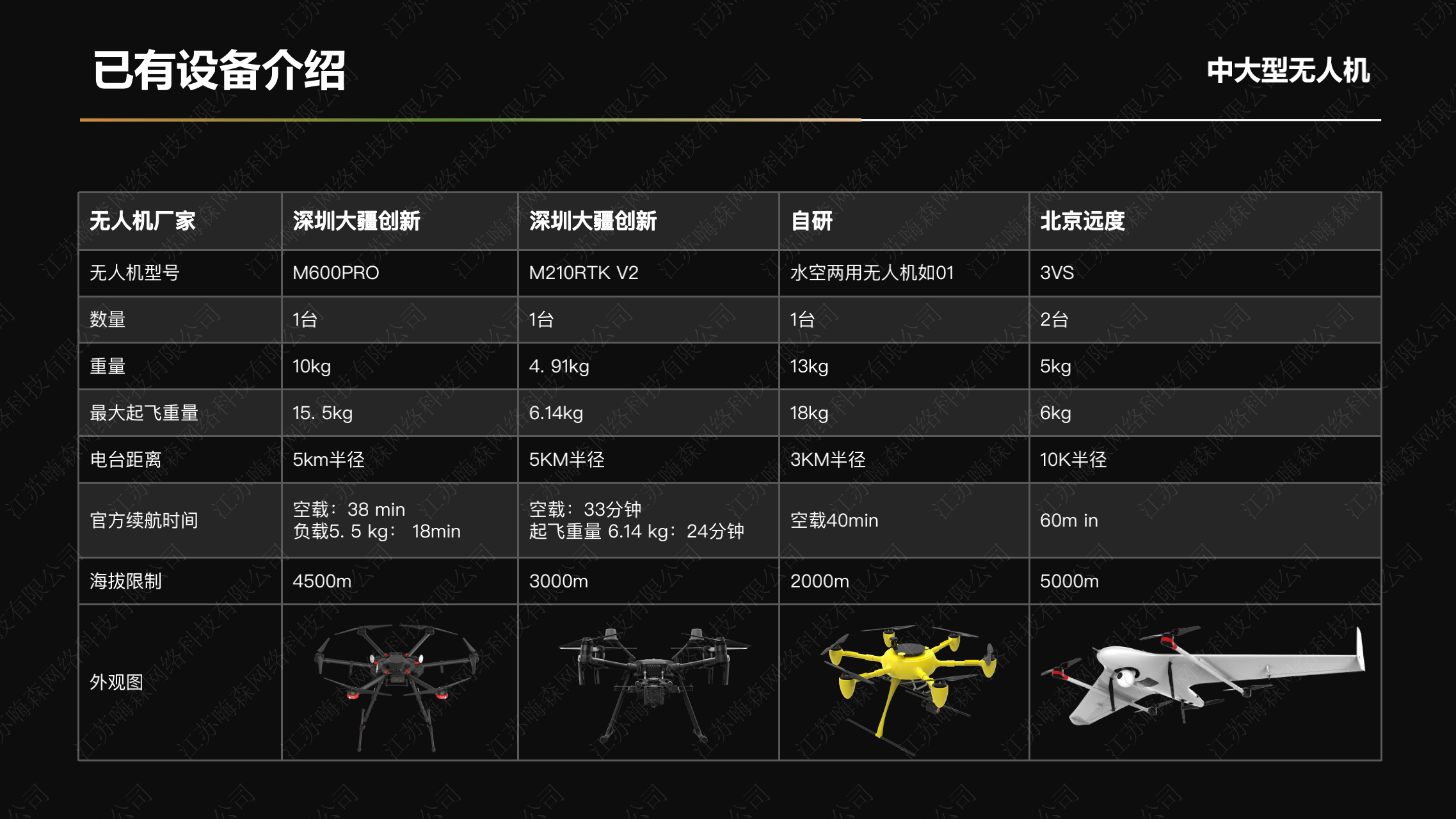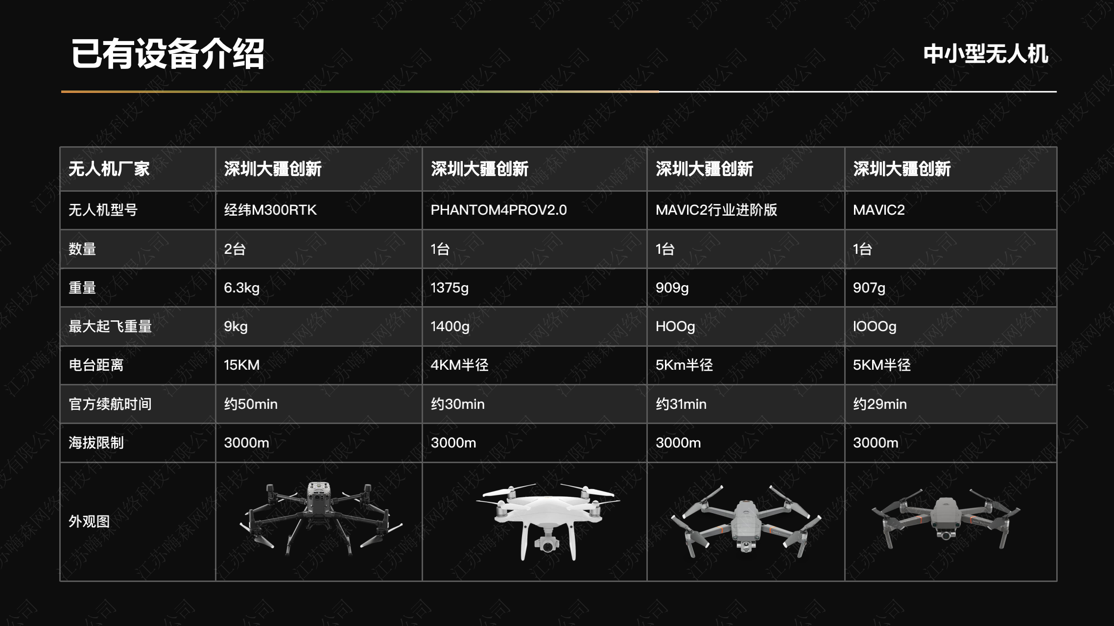 公司提供大疆(DJI)無(wú)人機(jī)、垂直起降固定翼、多功能負(fù)載、應(yīng)用平臺(tái)及反制監(jiān)測(cè)設(shè)備等。
