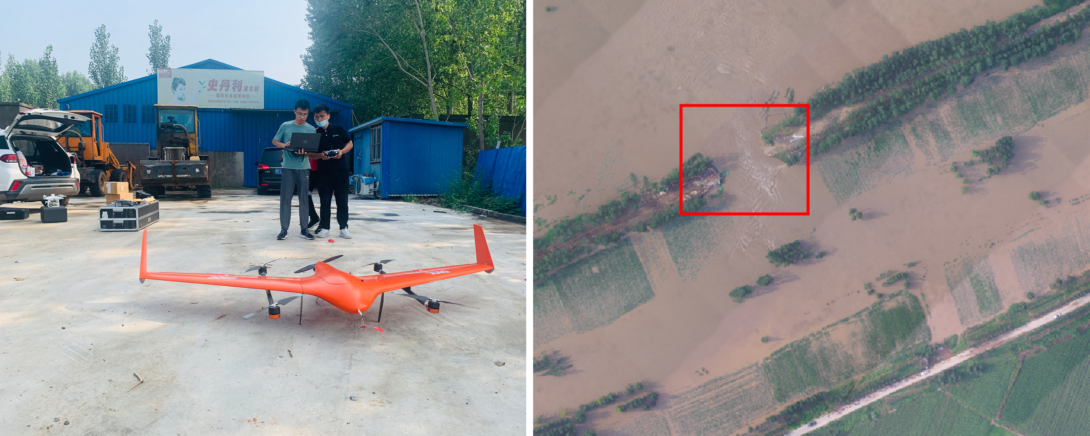 7月25日,小分隊(duì)成員深入抗洪一線,在決堤口附近利用無人機(jī)從高空點(diǎn)位持續(xù)監(jiān)測,不間斷回傳附近受損的村莊畫面。