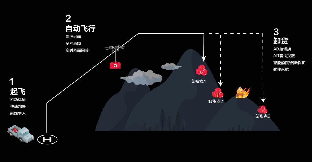 在突發(fā)自然災害或事故時,應急物資的及時運輸是搶險救災的關鍵保障。依靠救災人員背運十分辛苦,且難以高效持續(xù)地運輸。使用 FlyCart 30 可無視地形阻礙,半徑 10 公里以內 15 分鐘抵達,快速高效。