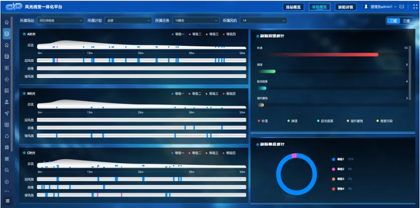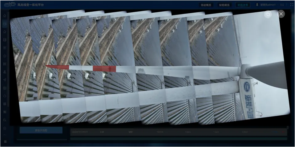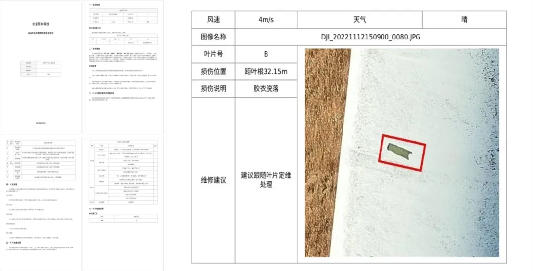 系統(tǒng)自動(dòng)將無(wú)人機(jī)拍攝的照片進(jìn)行智能拼接,生成完整的風(fēng)機(jī)全景圖像?;谠搱D像,智能檢測(cè)算法可精準(zhǔn)識(shí)別各類(lèi)缺陷,準(zhǔn)確率高達(dá) 90%,并自動(dòng)生成可視化分析報(bào)告。這大幅減少了人工分析的工作量,綜合成本較傳統(tǒng)方法降低了 65%,為后續(xù)維護(hù)決策提供了科學(xué)依據(jù)。