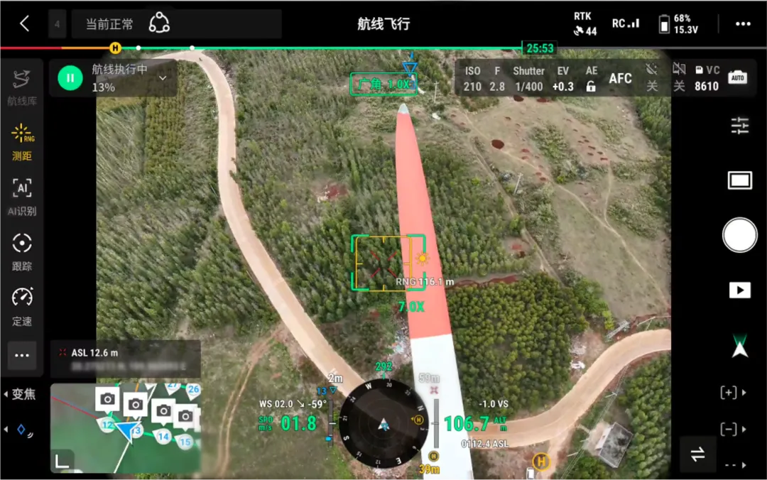 Matrice 4 系列無(wú)人機(jī)廣角相機(jī)具備 4800 萬(wàn)有效像素,能夠在安全距離內(nèi)獲取風(fēng)機(jī)的高清可見(jiàn)光照片,精準(zhǔn)捕捉葉片上的每一處細(xì)節(jié)。無(wú)人機(jī)自動(dòng)執(zhí)行航線(xiàn)任務(wù),全程無(wú)需人工干預(yù),省時(shí)又省心。