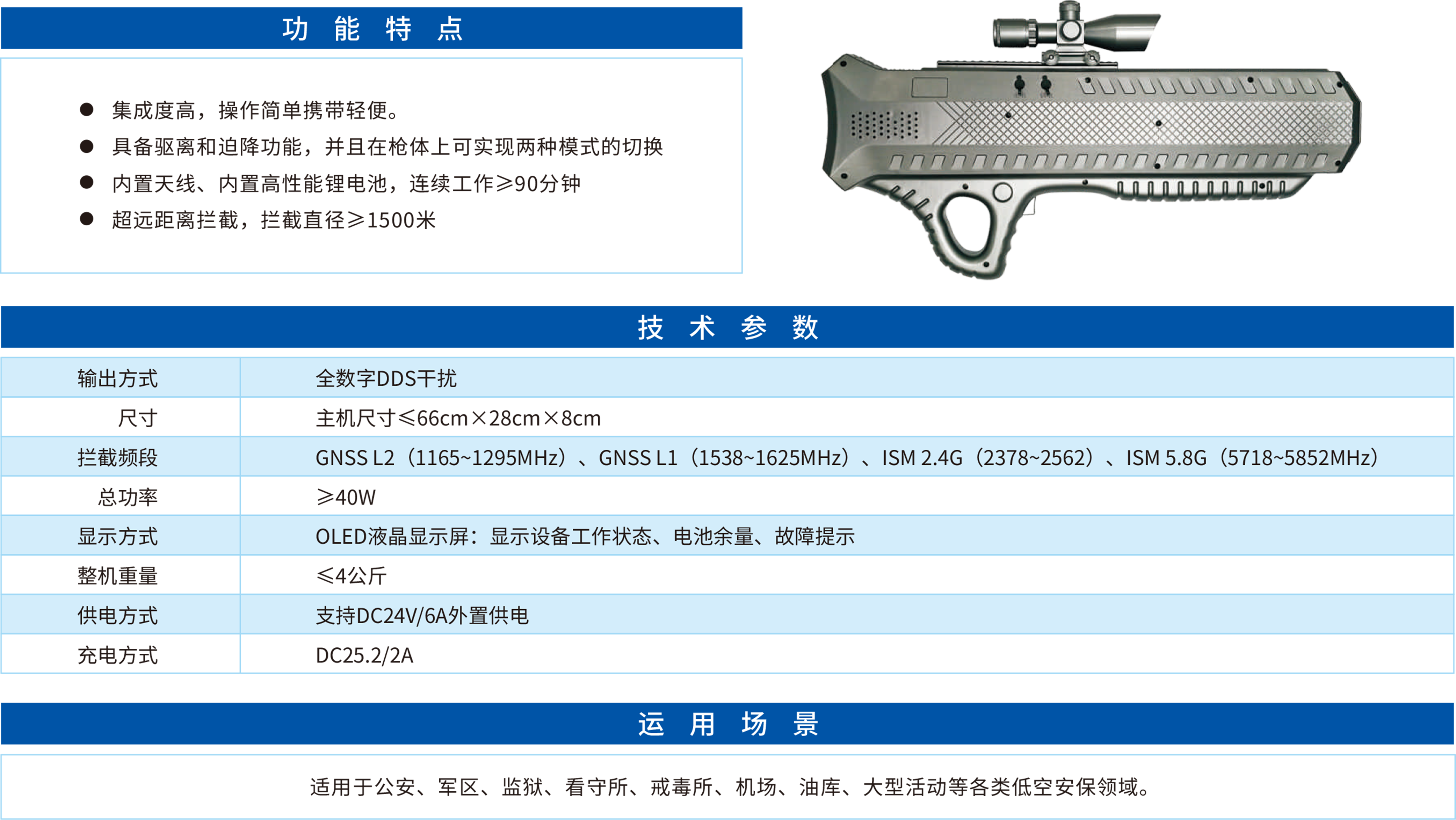 HUP0443M手持無(wú)人機(jī)干擾器是我司自主研發(fā)生產(chǎn)的一款大功率手持式無(wú)人機(jī)攔截設(shè)備,支持多種攔截頻段,可針對(duì)市面民用無(wú)人機(jī)進(jìn)行有效的干擾、攔截,酷似搶型,握持手感好,操作簡(jiǎn)單,是名副其實(shí)的「無(wú)人機(jī)干擾槍」。